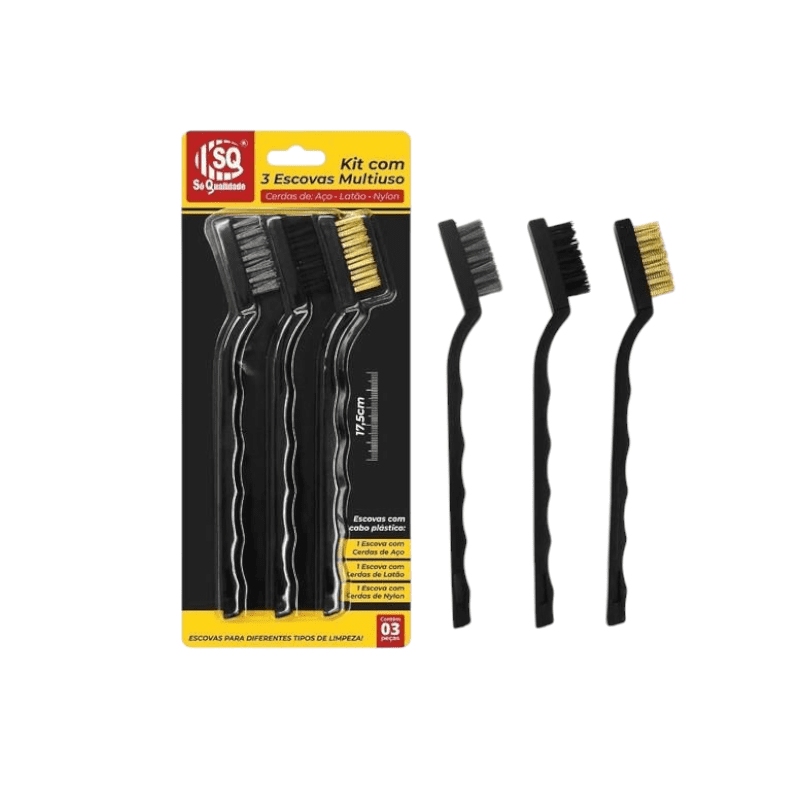 O Kit com 3 Escovas Multiuso SQ-4276 é a solução ideal para quem busca eficiência na limpeza de diversos materiais. Com escovas de cerdas de aço, latão e nylon, este conjunto foi pensado para atender às necessidades do dia a dia.