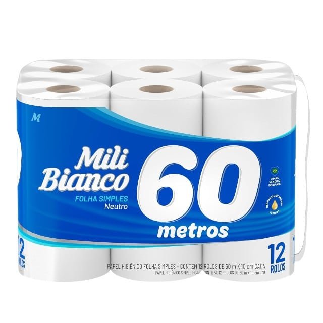 Mili Bianco Papel Higiênico 60m Folha Simples Neutro – 12 rolos